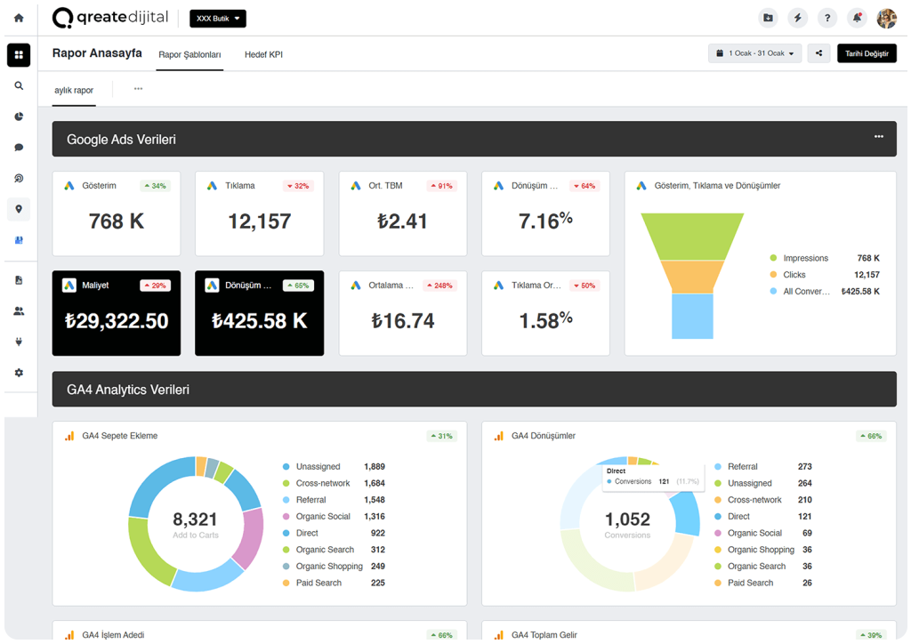 Renat Dijital Rapor Paneli, e-ticaret sitelerinizdeki satış raporlarından, *Google Ads, Google Analytics 4, Meta reklamları, Instagram, LinkedIn, YouTube gibi sosyal medya hesap performanslarına kadar birçok veriyi gerçek zamanlı olarak bir araya getirir.